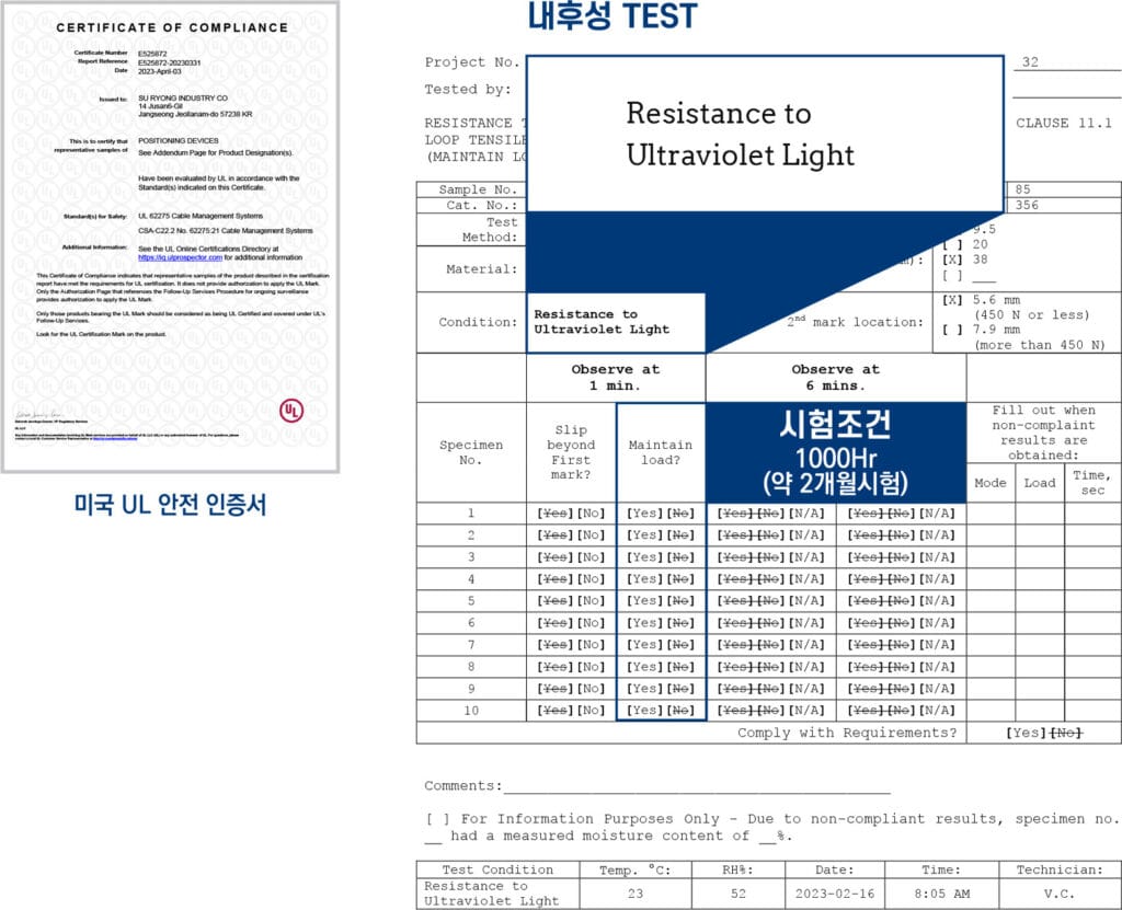 국제적으로 신뢰받는 UL 인증을 획득한 제품이라는 점도 중요한 특징입니다. UL 인증은 제품의 안전성과 품질이 글로벌 기준에 부합함을 증명하는 것으로, 해외 현장에서도 믿고 사용할 수 있는 품질 보증이 됩니다. 따라서 국내외 다양한 프로젝트에 안정적으로 적용할 수 있습니다.